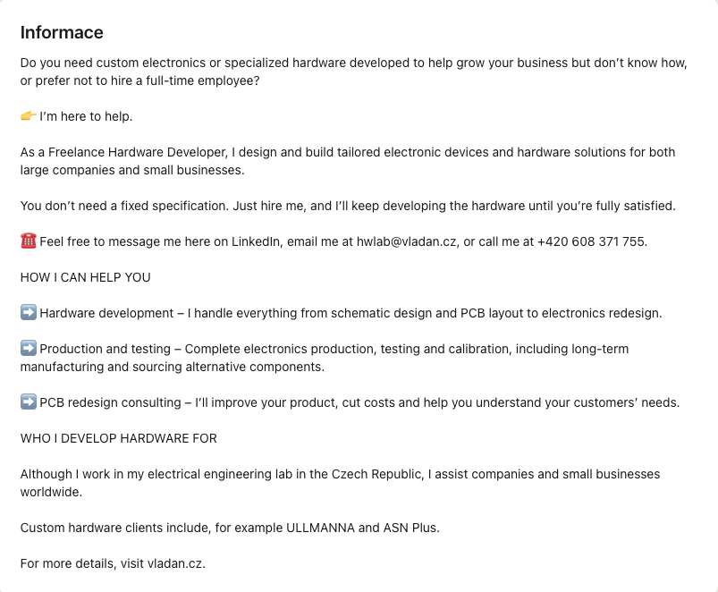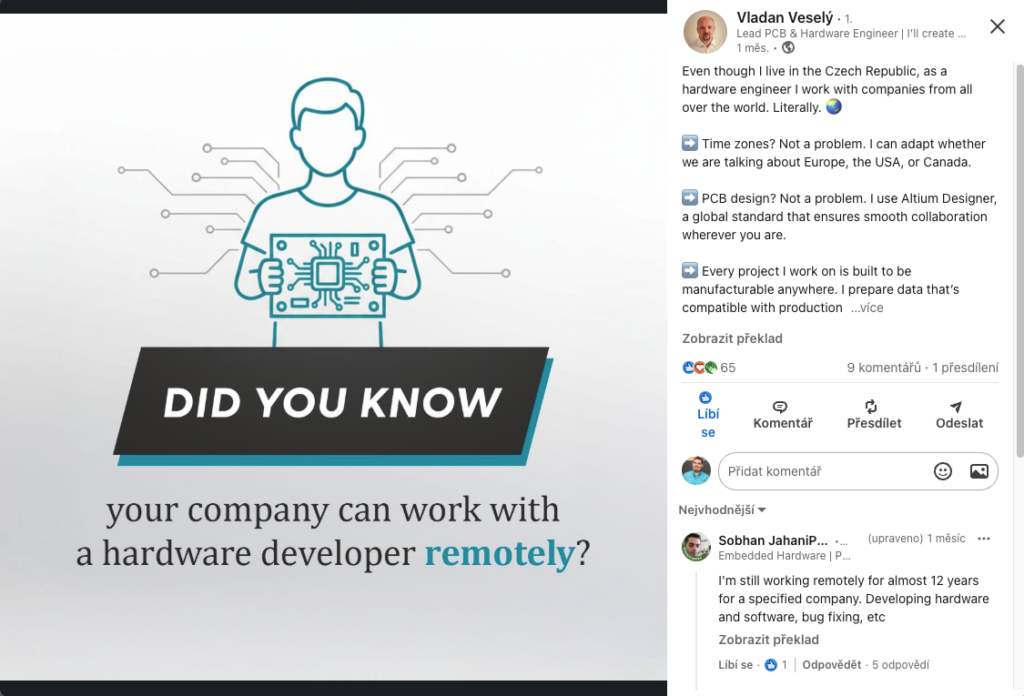 „Bylo příjemné, že mi hned v počátcích pravidelného zveřejňování příspěvků psali a volali staří známí, kolegové a kamarádi. Zároveň jsem se seznámil s mnoha lidmi z oboru. Taky vnímám, že autentický LinkedIn profil je víc než klasický životopis, příspěvky pak výrazně zvyšují důvěru u potenciálních zákazníků.“ (Vladan Veselý, vývojář hardwaru na volné noze)
